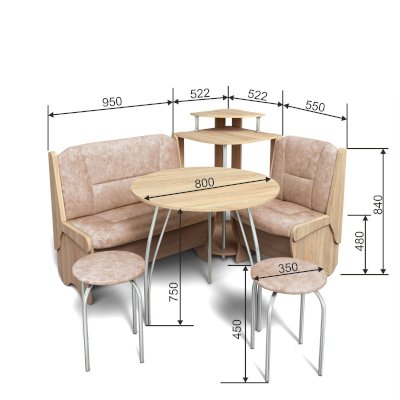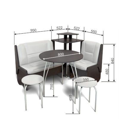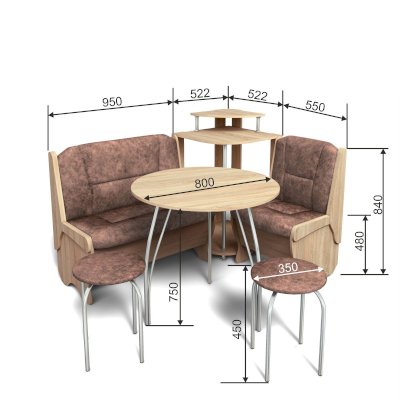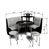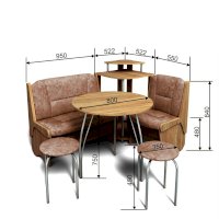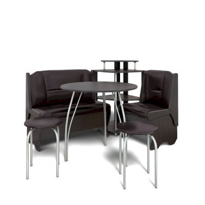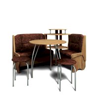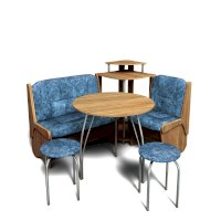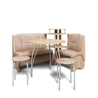 Оригинальный кухонный уголок Лотос отличается от других похожих кухонных гарнитуров. Он состоит из двух отдельных диванчиков и этажерки, заменяющей угловую мягкую часть. Круглый кухонный стол в отличие от других наборов мебели на металлическом основании как и два круглых табурета. Набор мебели для кухни включающий в себя большую прямую скамью,малую прямую скамью,угловую этажерку, стол на металлических ногах и два табурета на металлокаркасе. В прямых скамьях под сиденьями расположены ящики.