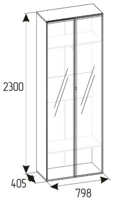 Двухдверный распашной шкаф легко открывается за ручку-петлю из микрофибры, которая устанавливается на одном зеркальном фасаде, другой - открывается за рамку. Шкаф комплектуется выдвижной штангой и двумя нишами сверху и снизу. Корпус шкафа выполнен в декоре Дуб Табачный. Регулируемые опоры компенсируют неровности пола.