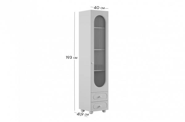 Модель оснащена одной распашной дверцей с вставкой из прозрачного рифлёного стекла, а также двумя вместительными выкатными ящиками в нижней части для хранения одежды, текстиля или аксессуаров. Внутреннее наполнение можно выбрать в зависимости от задач: шкаф комплектуется полками или штангой для плечиков, что позволяет адаптировать его под разные потребности.